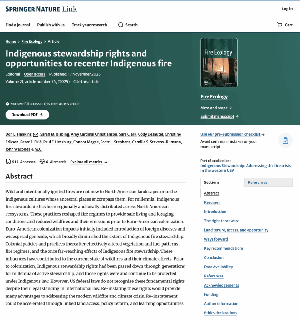 - Indigenous stewardship rights and opportunities to recenter Indigenous fire“Prior to colonization, Indigenous steward‑ship rights had been passed down through generations for millennia of active stewardship, and those rights were and continue to be protected under Indigenous law. However, US federal laws do not… Read more: Indigenous stewardship rights and opportunities to recenter Indigenous fire