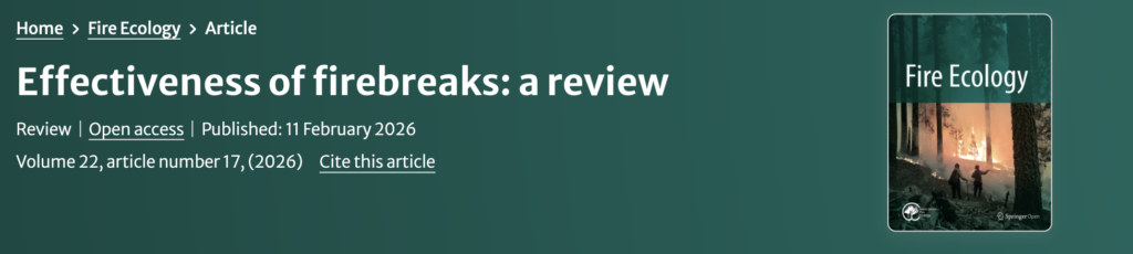 - Effectiveness of firebreaks: a review“This review synthesizes current knowledge on firebreak design, application, and performance, focusing on the mechanisms driving breaches and identifying priorities for improving their effectiveness.” Read HERE