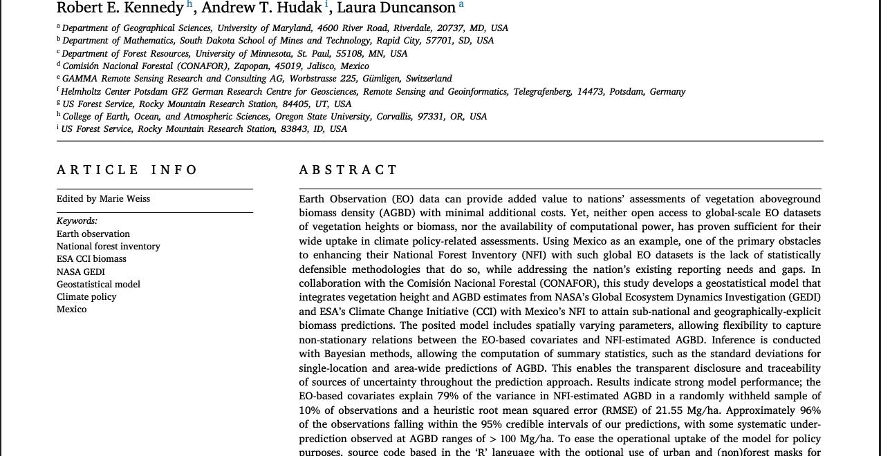 “In collaboration with the Comisión Nacional Forestal (CONAFOR), this study develops a geostatistical model that integrates vegetation height and AGBD estimates from NASA’s Global Ecosystem Dynamics Investigation (GEDI) and ESA’s Climate Change Initiative (CCI) with Mexico’s NFI to attain sub-national and geographically-explicit biomass predictions. The posited model includes spatially varying parameters, allowing flexibility to capture non-stationary relations between the EO-based covariates and NFI-estimated AGBD.”