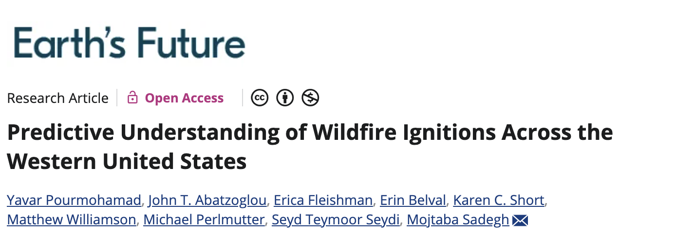Pourmohamad, Y., Abatzoglou, J. T., Fleishman, E., Belval, E., Short, K. C., Williamson, M., et al. (2026). Predictive understanding of Wildfire ignitions across the western United States. Earth’s Future, 14, e2025EF006935. https://doi.org/10.1029/2025EF006935