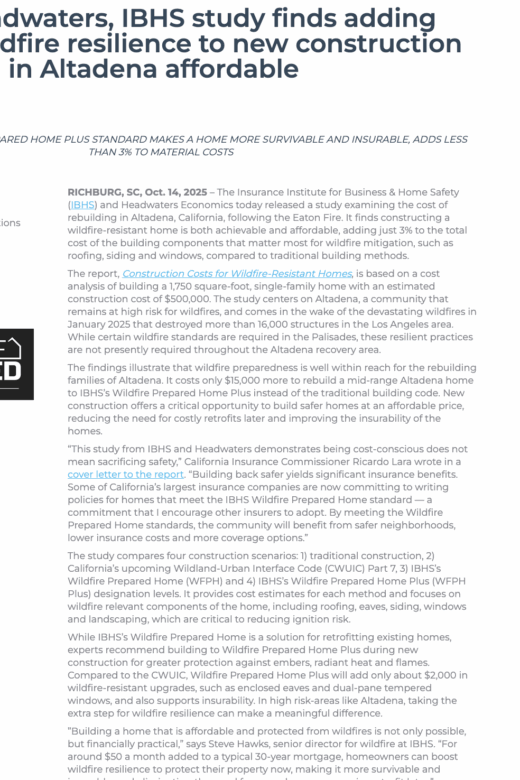 " RICHBURG, SC, Oct. 14, 2025 – The Insurance Institute for Business & Home Safety (IBHS) and Headwaters Economics today …