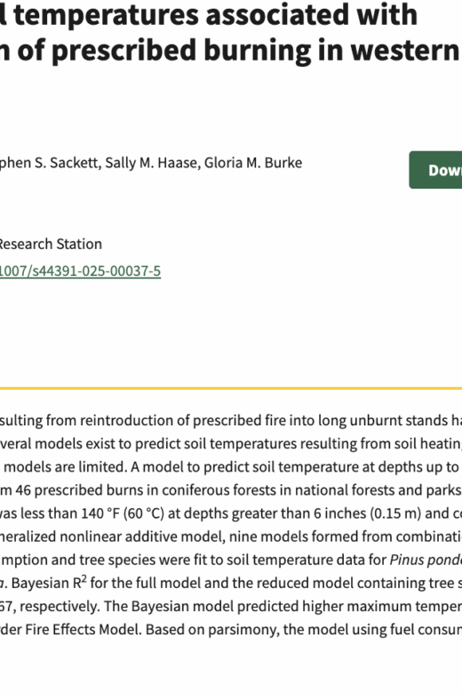 Predicting soil temperatures associated with reintroduction of prescribed burning in western coniferous forests "Elevated soil temperatures resulting from reintroduction of prescribed fire into long unburnt stands have been associated with …Continue Reading about Predicting soil temperatures associated with reintroduction of prescribed burning in western coniferous forests